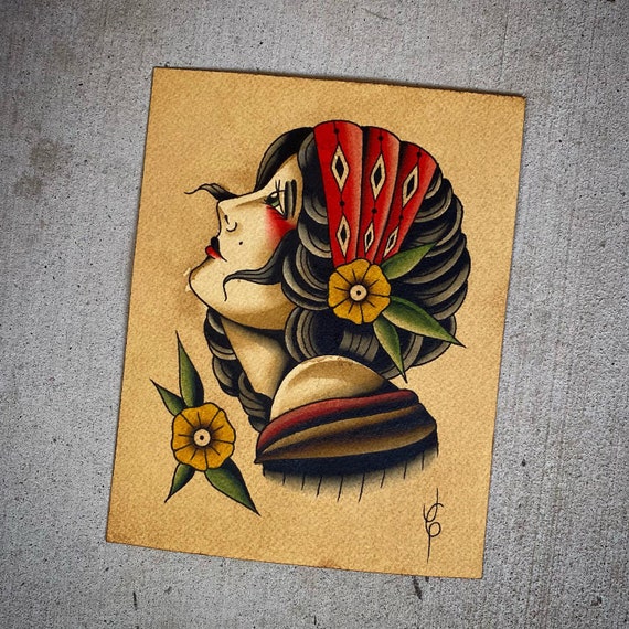 Girl Head And Flower American Traditional Tattoo Flash Print Etsy Uk
